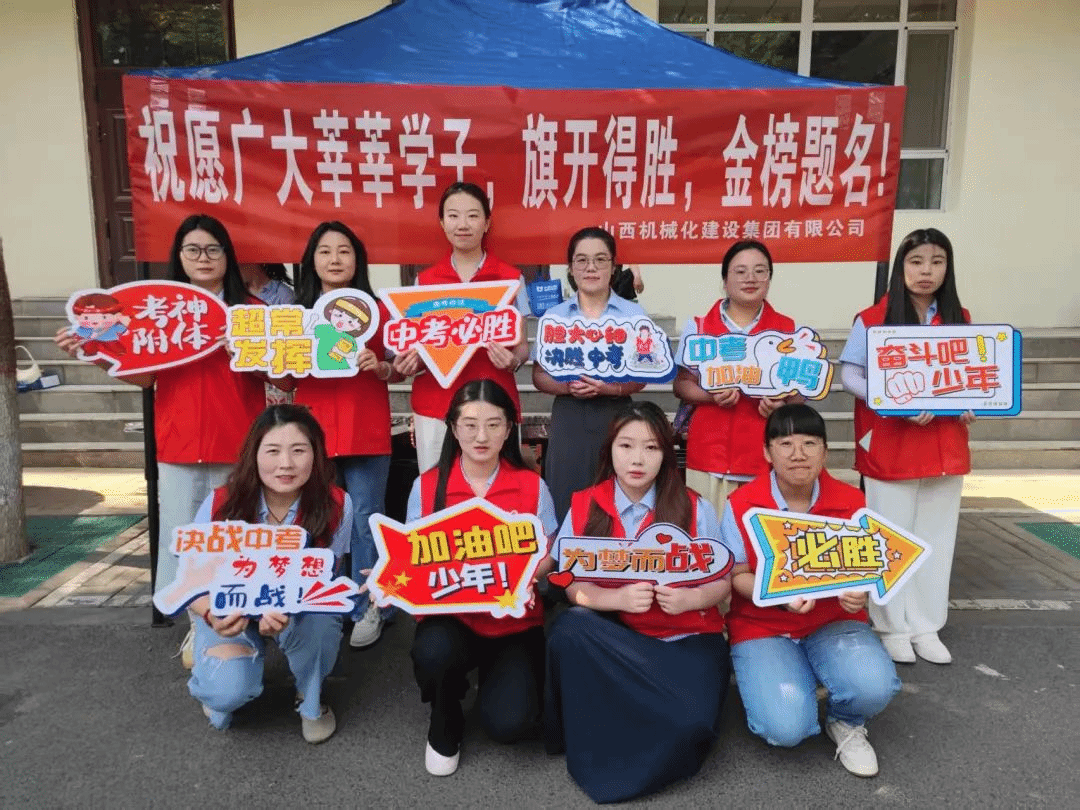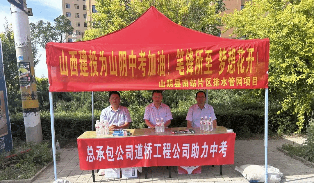 五建集团各下层单位、项目部在驻地科场周边起劲开展助考效劳。。。。。在朔州市应县一中考点,,,自愿者们提前搭建效劳站,,,为考生及家长准备了矿泉水、藿香正气水等消暑物资。。。。。在大同市云州区考点,,,自愿者们手持“中考必胜”加油牌,,,为过往考生送上勉励,,,资助他们缓解考前压力。。。。。