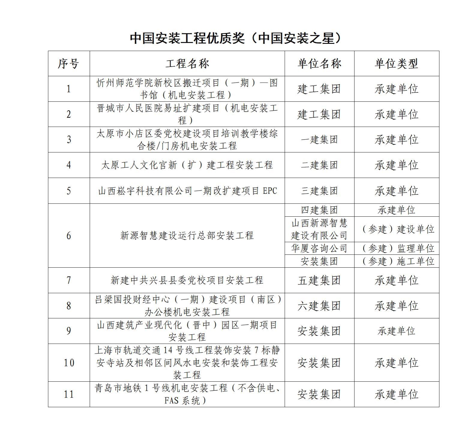 克日,,,,,2023—2024年度中国修建工程装饰奖第一批入选工程名单、2023-2024年度第一批中国装置工程优质奖(中国装置之星)入选名单宣布,,,,,山西建投集团13项工程获中国修建工程装饰奖11项工程获中国装置工程优质奖。。。。