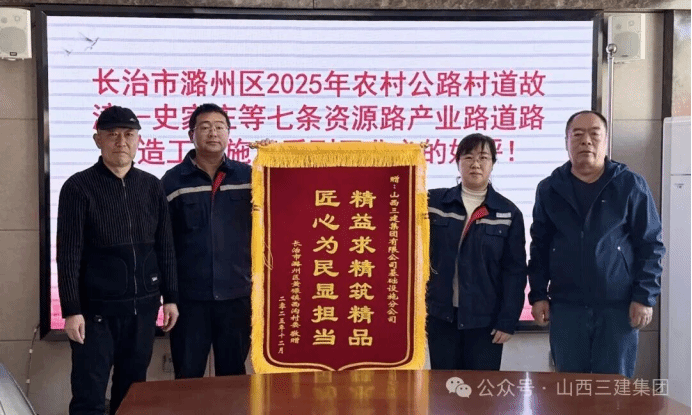 12月8日,,,,,长治市潞州区黄碾镇西沟村委向基础设施分公司赠予了一面写有“字斟句酌筑精品 匠心为民显继续”的锦旗,,,,,对分公司在潞州区2025年农村公路村道(故漳—史家庄等七条资源路工业路)刷新工程中的精彩体现予以高度认可。。村委赞扬了全体施工职员的辛勤支付与专业继续,,,,,同时也对分公司秉持匠心、深耕民生基建,,,,,高质量高效完成蹊径刷新使命,,,,,切实助力地方交通生长与民生改善,,,,,体现真挚谢谢。。