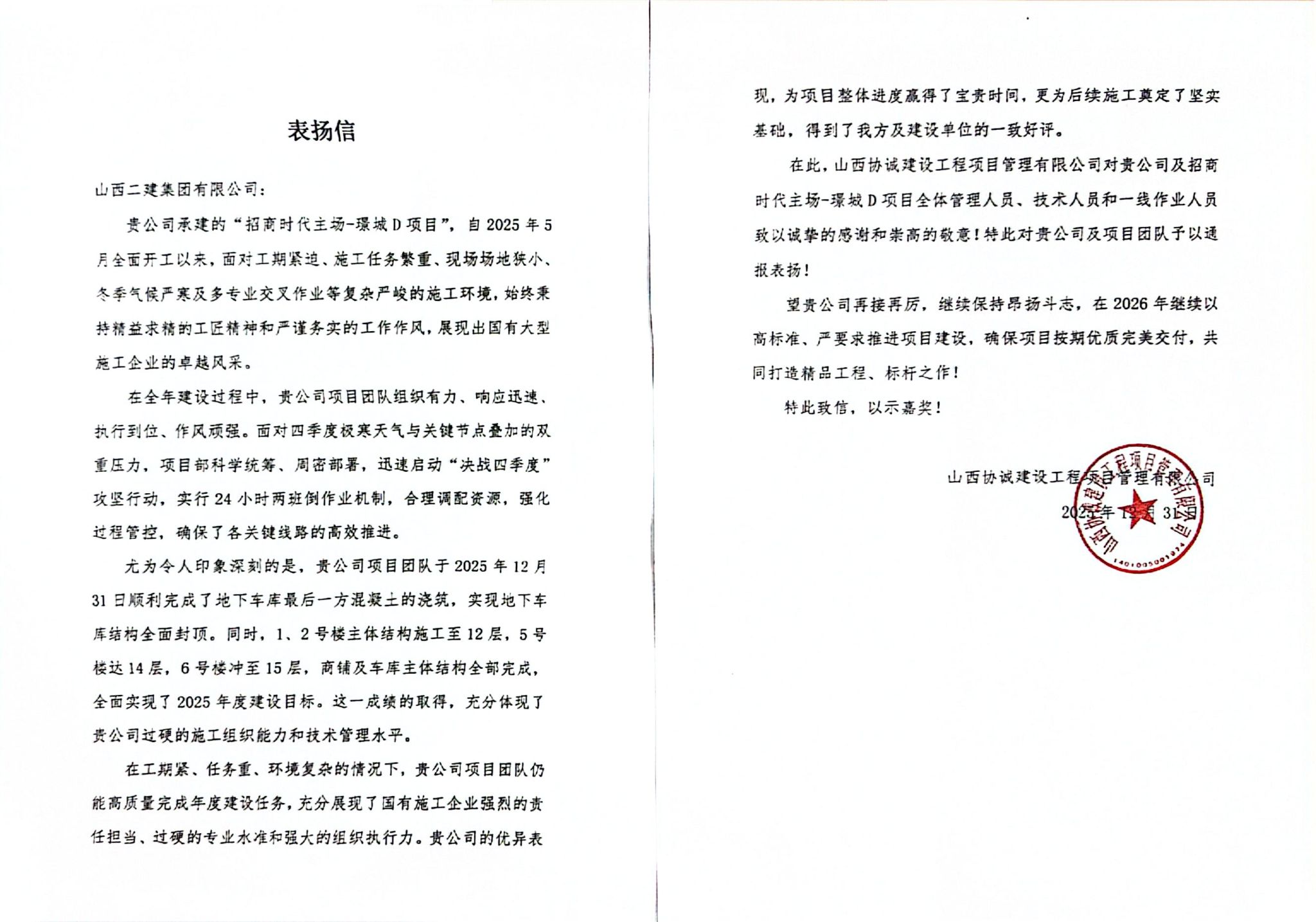 项目团队在工期紧、使命重、情形重大的情形下,,,仍能高质量完成年度目的,,,充分展现了二建集团的责任继续与专业水准。。在2025年尾,,,项目的高效推进、规范治理与团队的专业体现,,,赢得了尊龙凯时单位与监理单位的高度认可。。荣获由山西协诚尊龙凯时工程项目有限公司签发的《表扬信》。。