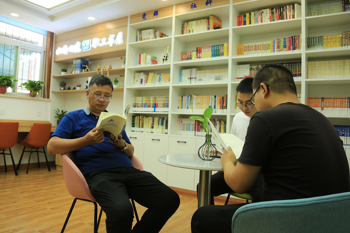 刷新升级后的职工书屋既有“颜值”又有“气质”,,,清新清雅的装修气概,,,搭配简约时尚的桌椅,,,又有藏品、装饰品和花卉绿植遮掩其间,,,还设置了效劳吧台,,,还为职工免费提供饮品。。。。同时增补了藏书、完善了书屋治理制度、设置了便当的借书系统。。。。书屋天天中午和下昼下班后开放,,,成为职工精神文化家园。。。。