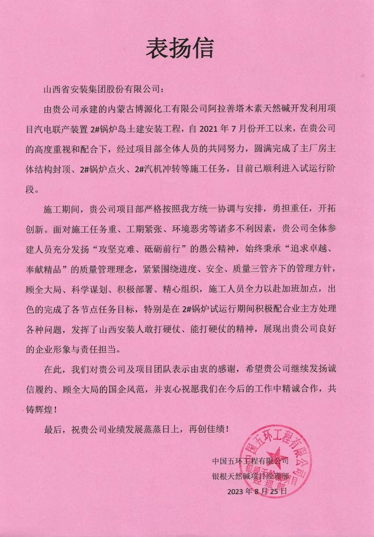 客户对项目部高效履约举行转达表扬。。。信中对项目工程进度、施工质量给予高度一定,, ,,,对施工历程的专业化治理水平给予高度赞扬。。。面临施工使命重、工期主要、情形恶下等诸多倒运因素,, ,,,项目部始终承继“追求卓越、贡献精品”的质量治理理念,, ,,,牢牢围绕进度、清静、质量三管齐下的治理目的,, ,,,顾全阵势、科学谋划、起劲安排,, ,,,有用包管2#锅炉乐成燃烧,, ,,,展现了优异的企业形象与责任继续。。。