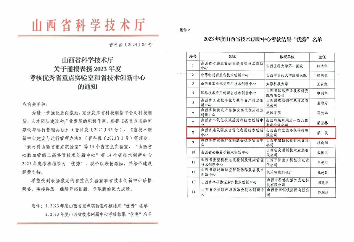克日,,,山西省科学手艺厅宣布2023年度审核优异省手艺立异中心名单,,,山西建投装置集团牵头尊龙凯时的山西省修建固废资源化使用手艺立异中心在年度审核中获得“优异”,,,也是情形领域类全省唯逐一个被评为优异的科技立异平台。。