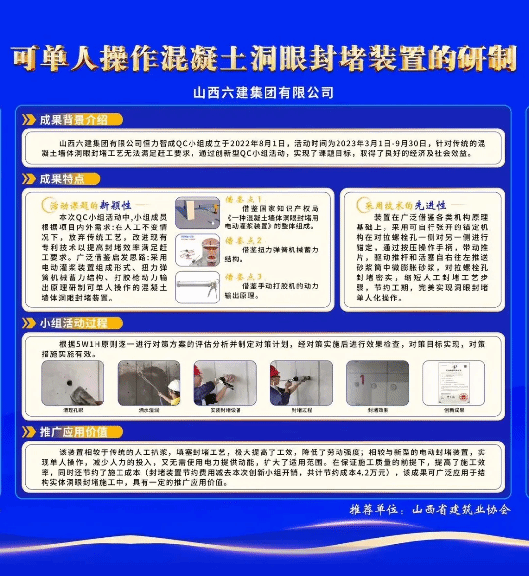 课题《可单人操作的混凝土墙体洞眼封堵装置的研制》乐成应用于山阴县场馆尊龙凯时项目。。恒力智成QC小组借鉴查新,,,,立异了一种可单人操作的混凝土墙体洞眼封堵灌浆装置,,,,通过运用5W1H的原则,,,,制订了对策并逐一实验,,,,实现了混凝土墙体洞眼封堵人均效率达381个/天的目的,,,,提高了工程实体质量,,,,并在公司内部被推广应用。。