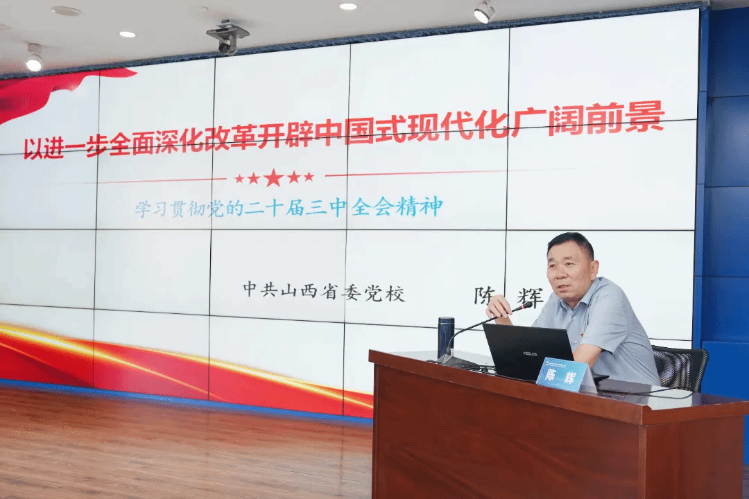 中共山西省委党校陈辉教授“以进一步周全深化刷新开发中国式现代化辽阔远景”为题,,,,牢牢围绕习近平总书记在党的二十届三中全会上的主要讲话和全会《决议》,,,,剖析了推进中国式现代化的时代配景、历史方位和使命使命,,,,阐释了进一步周全深化刷新的指导头脑、总目的和重大原则、重点领域。。。。陈教授的讲座语言生动、内容富厚,,,,充分运用典范案例和翔实数据,,,,资助学员一直加深对全会精神的明确。。。。