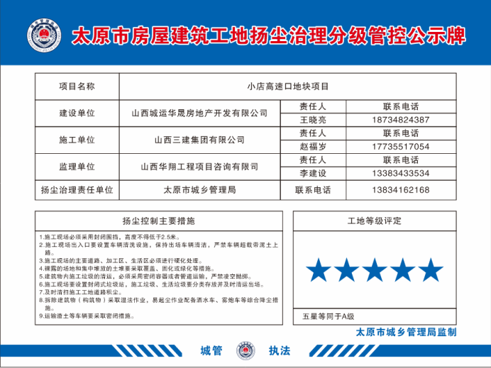 克日,,,,,太原市城乡治理综合行政执法队宣布2024年第二轮衡宇修建工地扬尘治理评级效果,,,,,山西建投三建集团承建的小店高速口地块项目在210个参评施工单位中脱颖而出,,,,,获“五星工地”殊荣。。