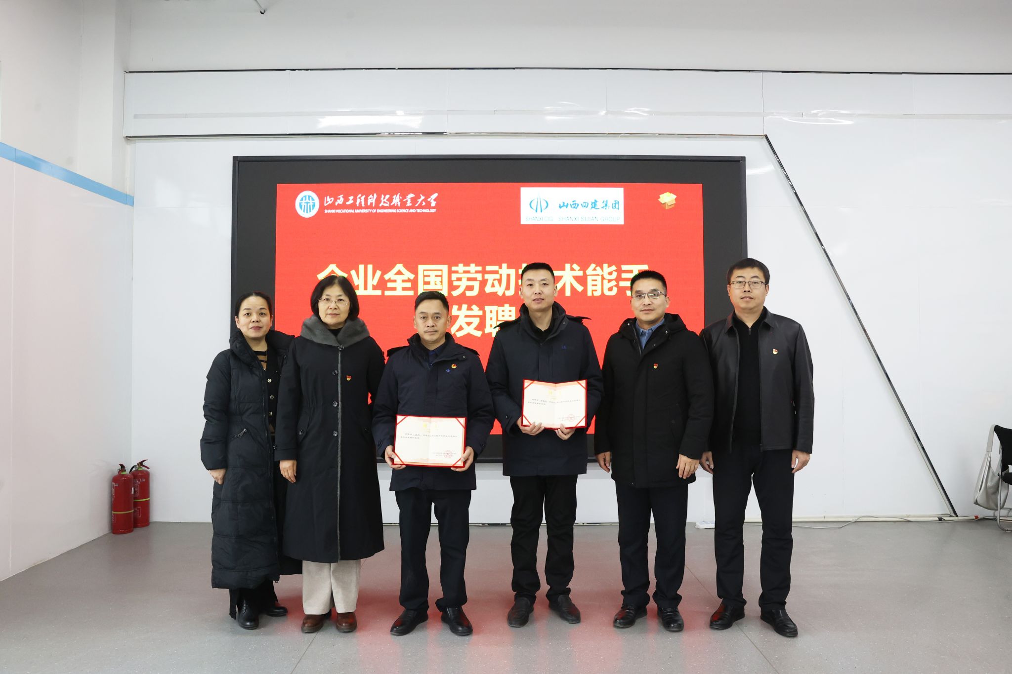 学院约请四建集团手艺中心总司理庄利军为山西工程科技职业大学修建工程学院智能制作工程专业企业专业带动人,,,,,约请友成劳务公司钢筋班组长张洪、砌筑技师申艳豹为修建工程学院企业兼职导师,,,,,并为他们揭晓聘书。。。
