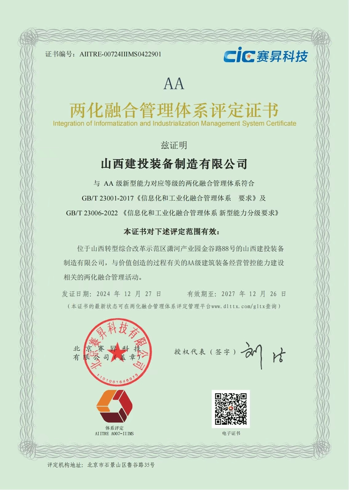 12月27日,,,山西建投工程机械公司顺遂通过国家两化融合治理系统评定,,,并获得AA级评定证书。。。